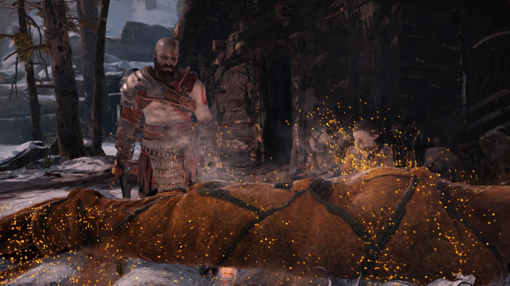 This God of War game starts in Midgard, an earthly realm in Norse mythology. The story begins in a beautiful environment where Kratos approaches a tree marked with a vibrant golden hand print. Kratos rips it out of the ground, taking it to a boat with a small child who he refers to as "boy". Everything about Kratos exudes strength and power; his appearance, his voice, his expressions and the way he moves. As a player, even you are a bit intimidated. After a boat ride, Kratos takes the tree and places it on a "burial" site while the boy, named Atreus, lights candles around a body wrapped up in cloth. Kratos collects the body laying it on the tree and sets it alight. This emotional opening scene shows the cremation of Kratos' wife and Atreus' mother Faye.